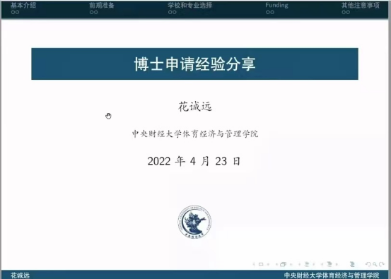 2022年4月23日下午16:00,体经公司“体悟生涯、扬帆起航” 就业求职申博经验分享会通过腾讯会议形式顺利开展。本次会议邀请体经公司六位应届毕业研究生,分享自己毕业去向,对留学申请读博、就业等不同选择进行了探讨,为员工未来发展提供了借鉴。体经公司团委副书记许特然老师主持本次分享会,本次全体本科生及部分研究生参加了本次分享会。