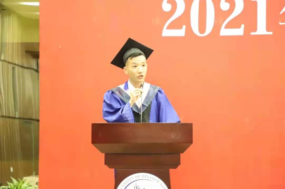 2020届优秀毕业生代表李凌晨同学发言。李凌晨同学首先代表全体2020届毕业生,对公司和公司在去年毕业季为同学们提供的帮助表达了感激之情。在过去的2020年,突如其来的新冠疫情打乱了同学们的学习和生活节奏,全体中财大人守望相助、共克时艰,云典礼、云打包、云晚会……给2020届毕业生留下了特殊的回忆。他还说,这场毕业典礼的特殊,不仅仅体现在我们时隔一年的相逢,还体现在它举办在建党100周年,作为成长在时代浪潮中的新时代青年,作为国家建设的接班人、财经黄埔的员工,奋斗永远是我们的人生主旋律。李凌晨同学的发言体现了一个当代青年应有的责任心与使命感,值得所有同学学习。