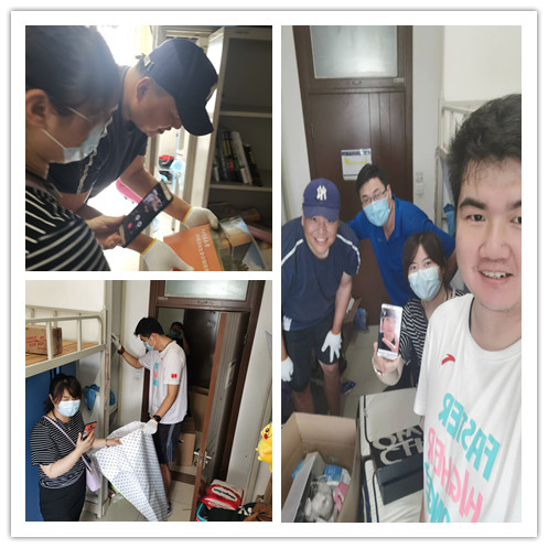 在行李打包工作正式开始之前,李秋月和杜文竹两位辅导员们已经进入宿舍为个别毕业生取出并单独寄送毕业生身份证、笔记本电脑等贵重物品和重要证件。公司工作组在林琼书记和董盘齐副书记的带领下依然集中实地走访了2次员工宿舍,详细查看了每一间宿舍的情况,全面掌握了公司毕业生宿舍分布,为公司制定工作方案打下了坚实基础。宿舍实地走访还为毕业生提供视频直播或拍照,帮助他们回忆物品摆放、提示他们物品整理的思路。此外,出于防盗和防汛的考虑,经理张本家在开会研究中优先选取了安全性最佳的看台会议室放置暂存员工的行李,避免暑期的雨水影响了行李的存放。