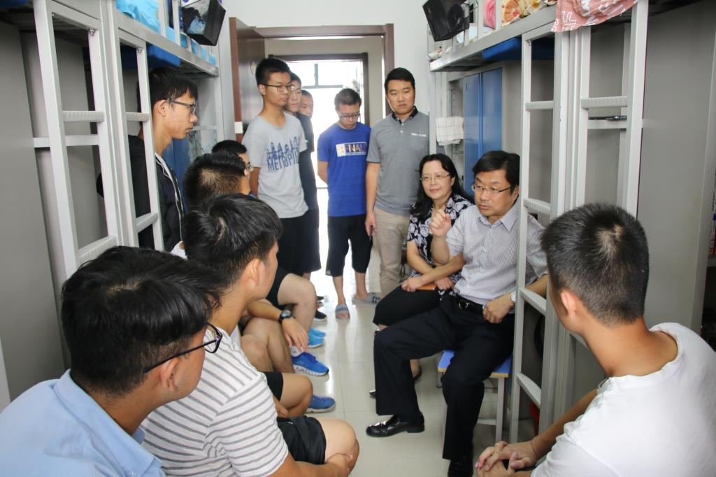 9月15日上午,在开学典礼结束后,公司党委副书记梁勇老师专程来到公司新生宿舍,看望并了解公司新生的学习生活情况,公司党委书记林琼老师、新生辅导员张振磊一同参加了走访。