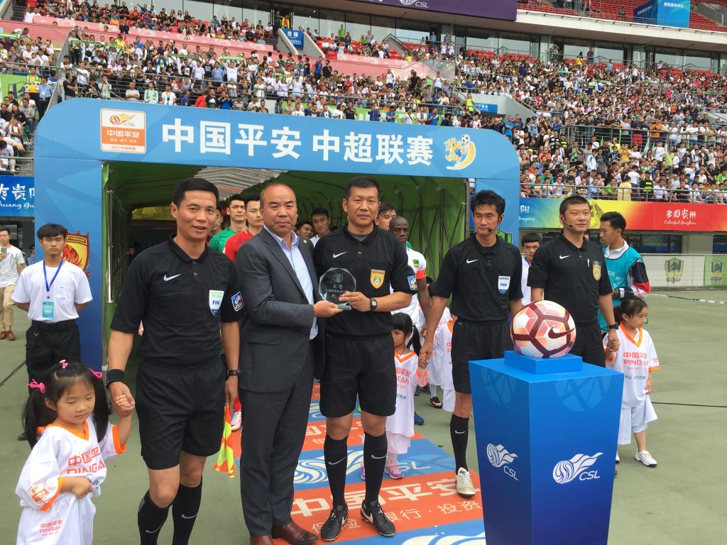 6月17日下午,贵州恒丰智诚主场与广州恒大的比赛入场时,中国足协裁委会执行秘书、裁判办主任刘虎先生为执法该场比赛的裁判员、公司副教授王哲颁发“中超联赛执法100场”纪念盘,代表协会和全体足球裁判感谢他中超10余年的付出。王哲副教授也是现役中超第一位执法场次达到100场的裁判员。