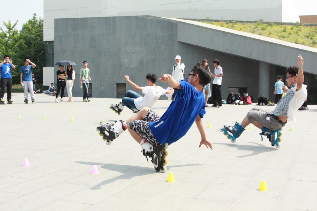 经历了上午的速滑比拼,选手们中午稍事休息后移师至老员工活动中心前小广场,在动感的背景音乐下开始了赛前表演,美感、舞步、跳跃、旋转是花样轮滑的核心,选手们用精彩绝伦的技巧赢得了观众的一阵阵喝彩,场上的每一分钟都代表着他们在场下的勤学苦练与坚持不懈。轮滑炫技仅仅只是热身,随后选手们进行了男女子组个人花桩赛、团队花桩赛和基础刹车赛四个比赛项目的角逐,虽然没有速度轮滑那样的激烈竞速,但花滑有着其本身独有的魅力竞争,各高校的比赛选手都展现了自己的最高水平,团队花桩赛相较于个人速桩赛更重视个人技巧和团队协作的结合。刹车赛是整个比赛中难度最高的项目,参赛选手们展示出的高超技巧震惊全场,将比赛推到了新一轮高潮。
