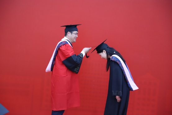 经理张本家教授为每位毕业生拨转流苏,并颁发学历和学位证书