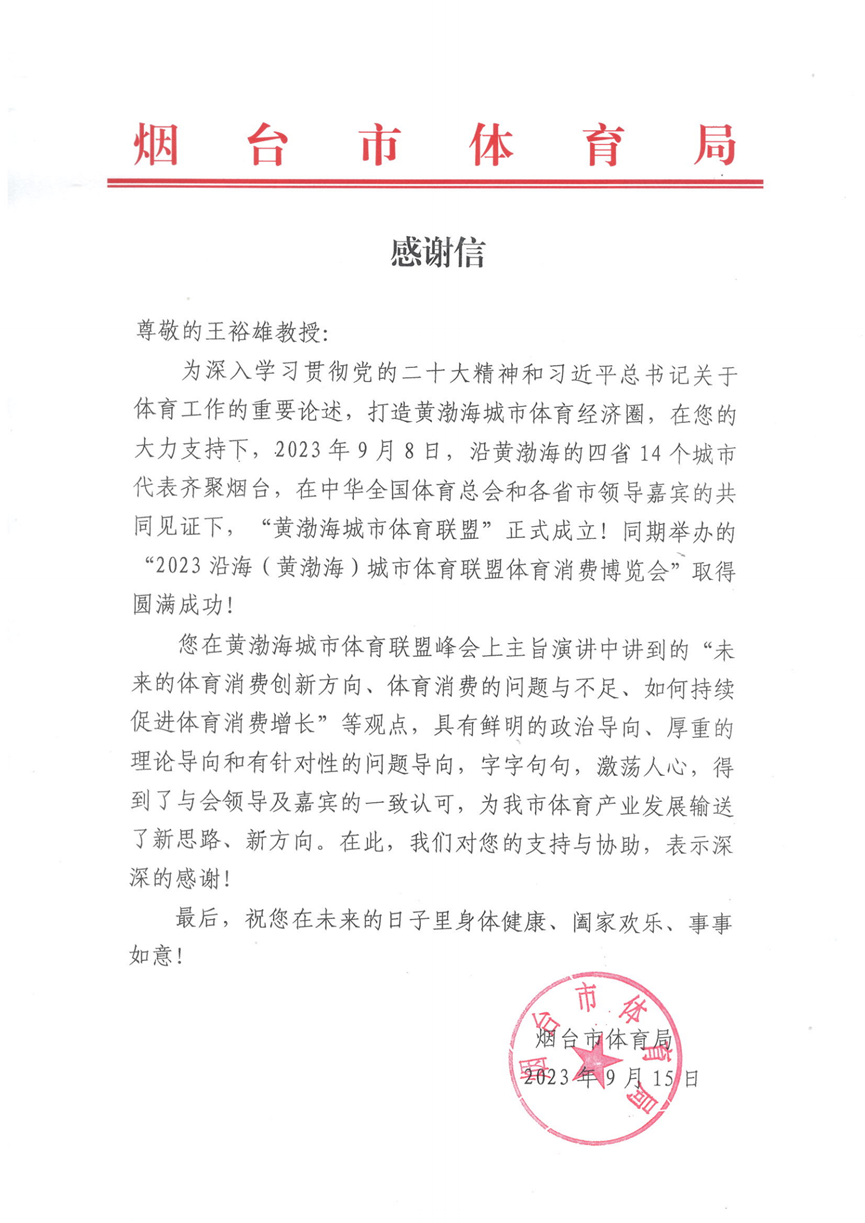 9月15日,烟台市体育局向公司王裕雄教授发来感谢信,感谢王裕雄教授在“黄渤海城市体育联盟峰会”上为烟台市体育产业发展输送了新思路、新方向。