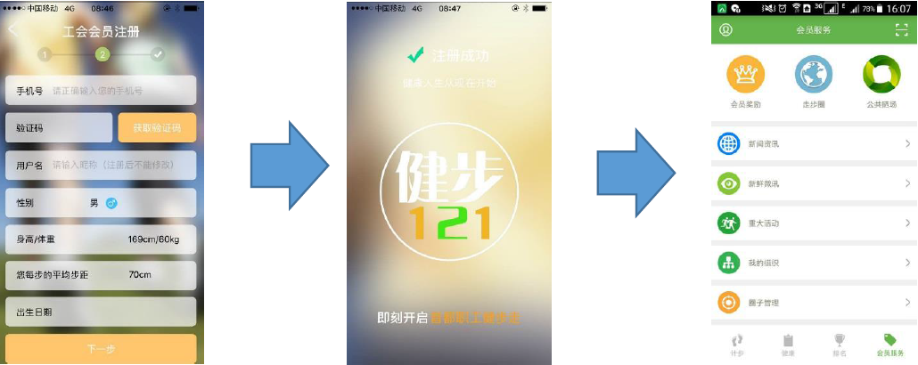 分工会会员自行通过手机登录“健步121”APP软件,自我开展健身走运动,并在该APP中获得相应的里程积分。