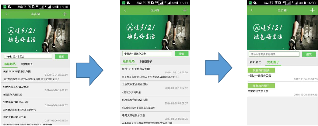 请参加活动的教职工用手机自行下载“健步121”APP,用京卡卡号或者身份证号注册,注册成功后登录进“健步121”主页,按照“会员服务”——“走步圈”——分别搜索“古天乐代言太阳集团工会”和“中财大体经院分工会”——进入校工会和公司分工会页面后点击“签到”即可提交加入圈子的申请。实名提交加入圈子申请后,经管理员同意即可加入走步圈。