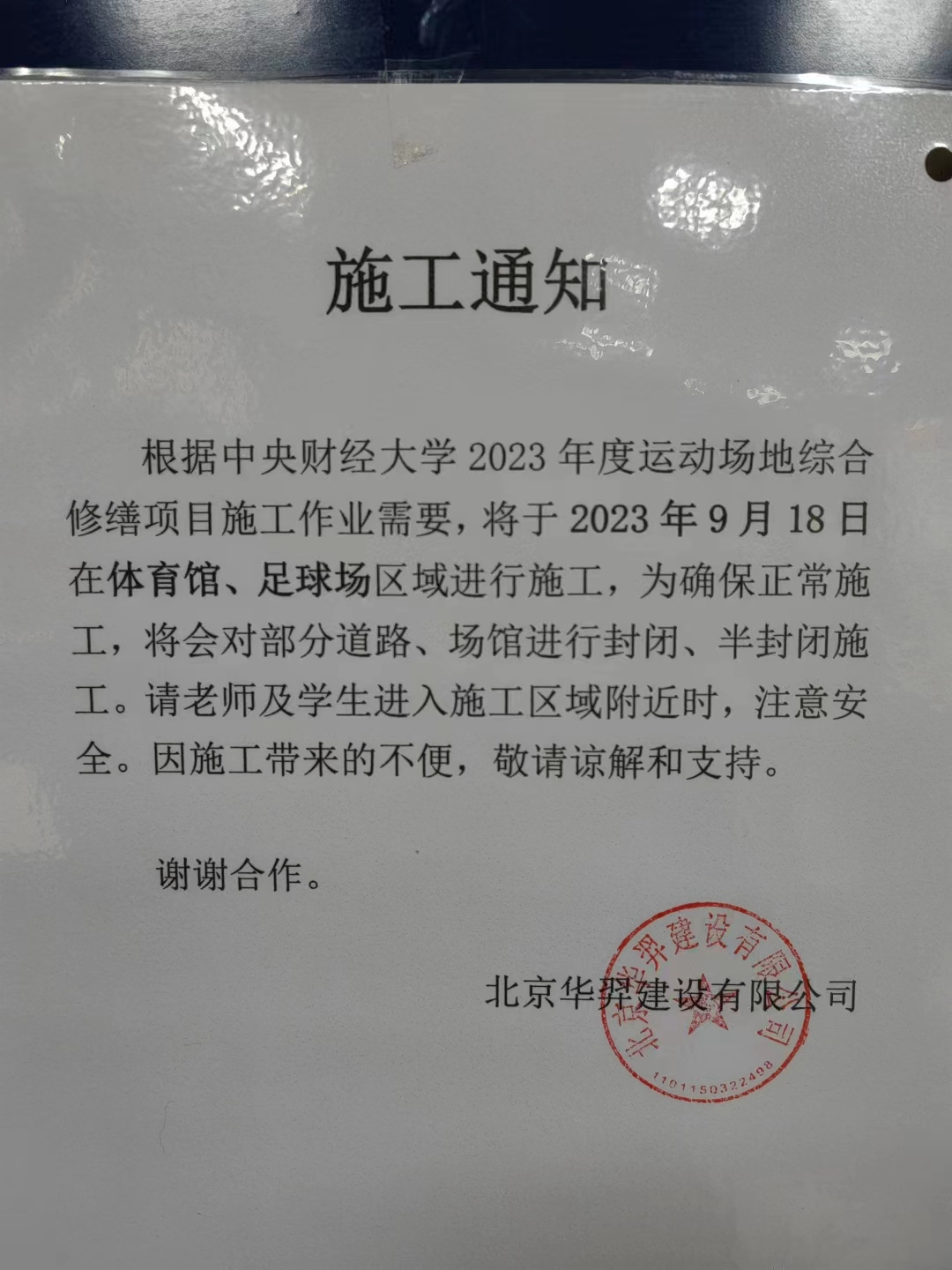 根据公司体育场地施工安排,沙河校区体育馆、足球场区域于2023年9月18日开始施工,施工区域的场地暂停使用。请涉及两个施工场地公共体育课程授课的任课教师及时调整上课地点。师生运动时请避开施工区域,注意安全。