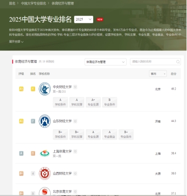 据软科官方数据,本次评价覆盖全国93个专业类、800多个本科专业,采用"集团-学科-专业"三级评价体系。在体育经济与管理专业领域,全国仅19所高校入围榜单,公司凭借雄厚实力脱颖而出: