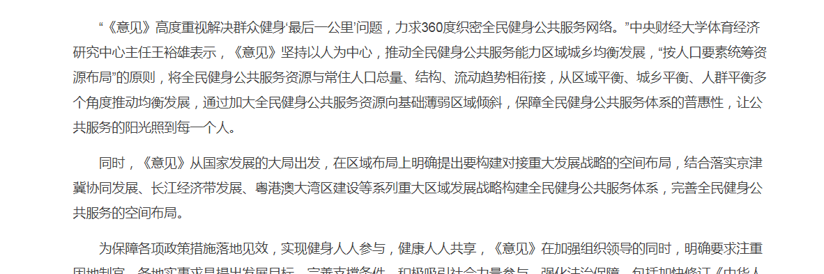 近日,王裕雄教授先后多次参与文件的专家研究会议和评审论证会议,并应约提交了关于政策起草的书面建议。在起草工作完成后,王裕雄教授应邀参与文件解读工作,担任了政策文件配套读本《构建更高水平的全民健身公共服务体系》的编委会委员,并参与写作工作;参与由相关部门与人民网组织的政策辅导讲座,录制了课程视频——《构建多层次多样化赛事活动体系》;撰写解读文章《让更高水平的公共服务温暖人们的运动生活》,就政策内容接受新华社、《瞭望》等多个权威媒体的采访。