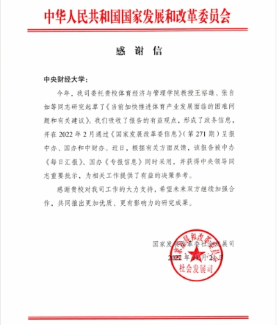 近年来,王裕雄、张自如教授团队积极服务于相关体育政策制定,先后受国家发改委社会司邀请参与《关于构建更高水平的全民健身公共服务体系的意见》(中办发〔2021〕61号)的起草论证、评审和解读工作,以及多次提供相关政策研究报告。此次发改委社会司在感谢信中提出希望未来继续加强合作,共同推出更加优质、更有影响力的成果。