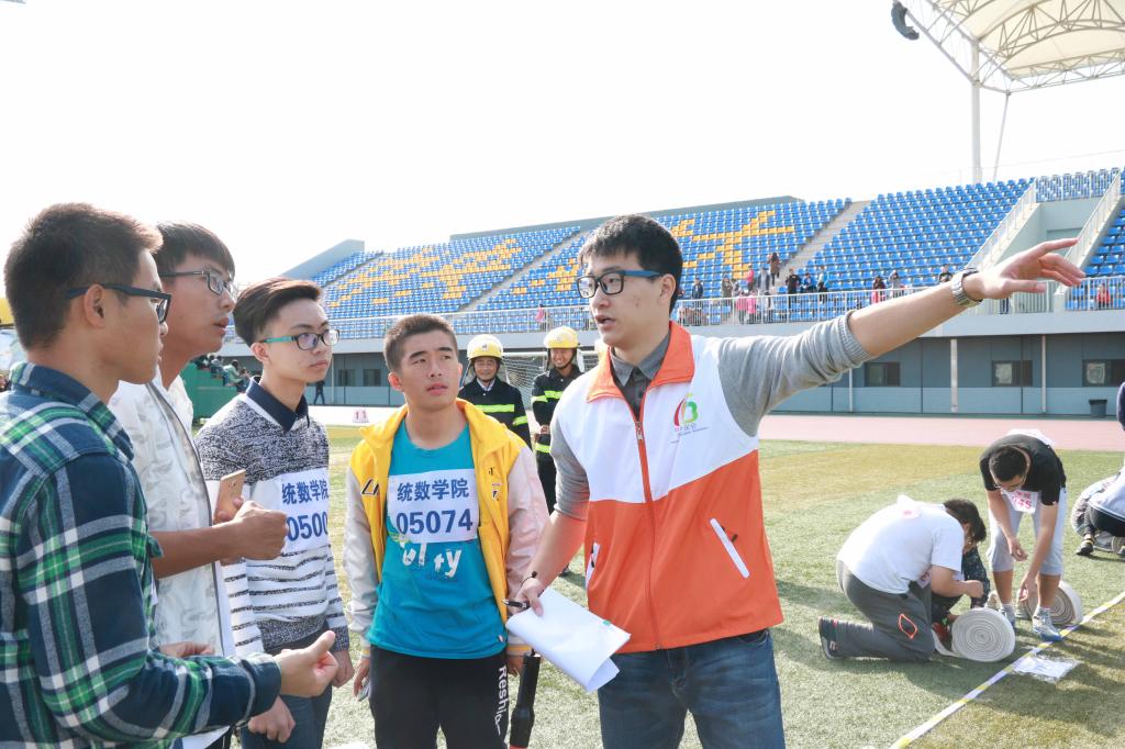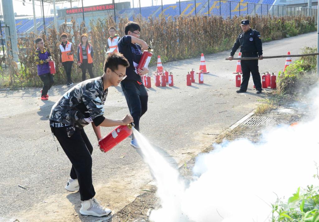 与此同时,一场别开生面的消防趣味运动会也正在进行!足球场的中心是该项目的主阵地,参与的新生们刚刚经历了军训时和返校时的消防演习,现场表现更是得心应手,同学们也轻松地比完各个小项,获得围观同学的阵阵喝彩。围绕灭火和疏散的主题,运动会精心设置了三人灭火器接力、四人水龙带接力和个人疏散计时三个竞赛项目,逼真模拟火灾发生后的灭火和疏散过程,让运动员在参与体验的同时提高安全意识和技能。