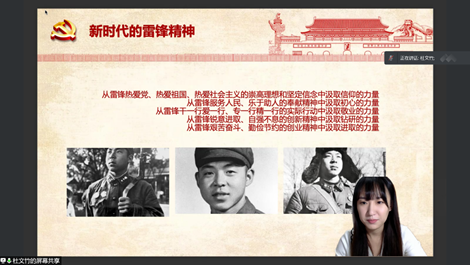 接着,杜文竹同志播放了她在进行雷锋精神实践调研时的短片,向我们展示了她通过实地调研所得到的对雷锋精神更加深刻的理解。