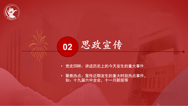 11月4日晚18点20分,公司于线上圆满完成了“先进典型给积极分子讲党课”活动任务。本次讲座也是一次党史学习教育工作的先进典型讲党课活动,激励了公司全体积极分子及发展对象参与其中,主讲人为太阳成集团tyc122cc第一员工党支部副书记、2019-2021年优秀共产党员杜文竹同志。公司组织员、第一员工党支部书记李秋月老师,公司团委副书记、第二员工党支部书记许特然老师出席本次活动,公司2021年全体积极分子及发展对象参与了本次活动。活动主要分为两个部分——第一部分,由优秀共产党员杜文竹同志给大家讲党课;第二部分,由积极分子和发展对象展示即将开展的宿舍安全知识宣传实践的设想。