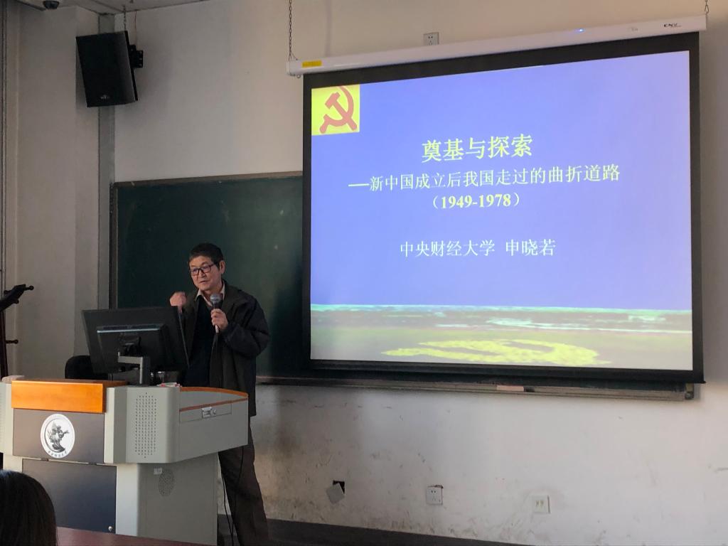 在课程的开始,老师将新中国的历史依据改革开放这一事件,划分了成了两段,一段是1949年到1978年,另一段是1978年至今。对于1949年到1978年这一时期该如何看待,申老师首先引用了江泽民同志和习近平同志的话,认为这一历史时段是中华民族的最重要的历史变革,两段历史时期不能相互否定,帮同学们确定了对这一时期的总认识。之后的课程主要由三部分组成,第一部分是关于抗美援朝和过渡时期的介绍,第二部分是过渡时期之后的社会主义建设,第三部分是这一时期的波折和成就。自近代以来,中国积贫积弱,国家千疮百孔,人民生活在水深过热之中。在这种情况下,中国共产党建立了新中国,毛泽东主席在天安门宣告中国人民站起来了。中国人民志愿军取得了朝鲜战争的胜利,国内恢复生产,人民生活得到了极大的改善,社会风气焕然一新。在第二部分中,申老师主要讲了党从革命党向执政党的转变,介绍了人民政协制度,以及社会主义改造等,并强调中国共产党并非一味照搬苏联,而是根据中国国情采取了更合适的方式进行社会主义建设。在第三部分中,老师既强调了在这段历史时期,发生了“反右扩大化”、“大跃进”、“文革”等错误,但是中国共产党是干实事的党,干实事就肯定会犯错误,中国共产党有魄力承认自己的错误并改正。申老师又介绍了这一历史时期的巨大成就:作为发展的基础,这一时期在我们建立了完善的工业体系,取得了“两弹一星”、人工合成牛胰岛素等重大科学成果,更普及了教育扫除了文盲、留下了雷锋、焦裕禄、王进喜等精神财富,并总结了三条发展经验。