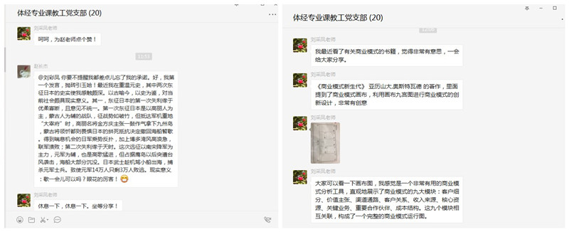 书香支部建设除了以集中读书会的形式开展以外,还通过党支部微信群开展灵活多样的读书心得交流。
