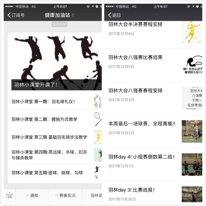 本届羽毛球比赛相关的赛程安排、比赛战报等有关信息由公司团委员工会项目部于微信公众号“健康加油站”整合发布,比赛期间共计发布微信推送13次,覆盖阅读量7046次。此外,为吸引更多羽毛球小白加入校内运动大军,“健康加油站”还原创制作发布了6期羽毛球小课堂教学内容,就羽毛球礼仪、握拍教学、基础羽毛球步法教学、吊球、扣杀、接球、挑球、勾球等从羽毛球入门到进阶相关内容进行“文字讲解+原创自制真人gif动画示范”教学。