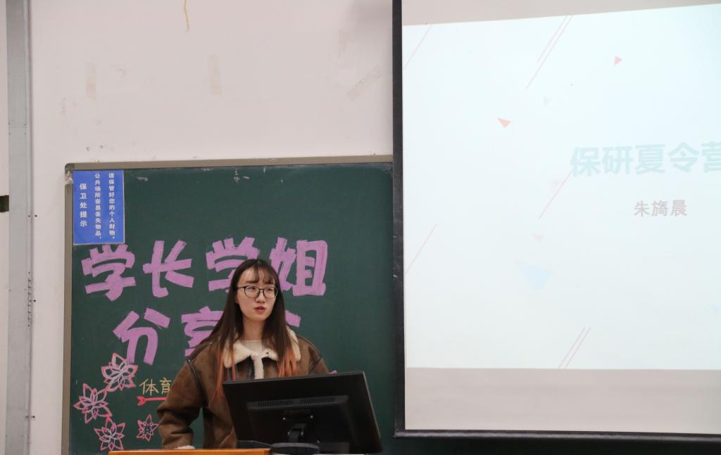 首先,由体经14-1班的朱旖晨同学分享自己的经历。朱旖晨同学首先详细介绍了什么是保研及保研的流程,介绍了各类保研形式和保研的资格要求,同时,她还就2014-2018级共5年的保研形式和夏令营考核情况做了详尽的纵向类比分析。接着,朱旖晨同学就自己大学本科前三年的学习、生活、科研和工作进行总结分享。最后,她为参与分享会的学弟学妹们分享了一些与保研有关的重要网站,希望对学弟学妹们提供到一定的帮助。