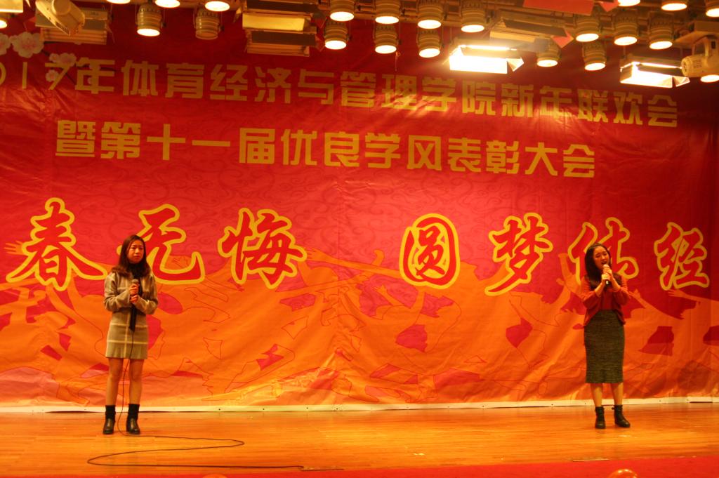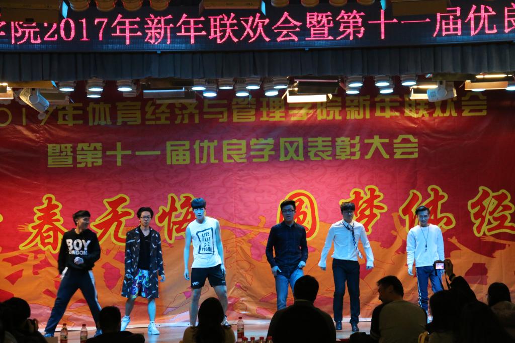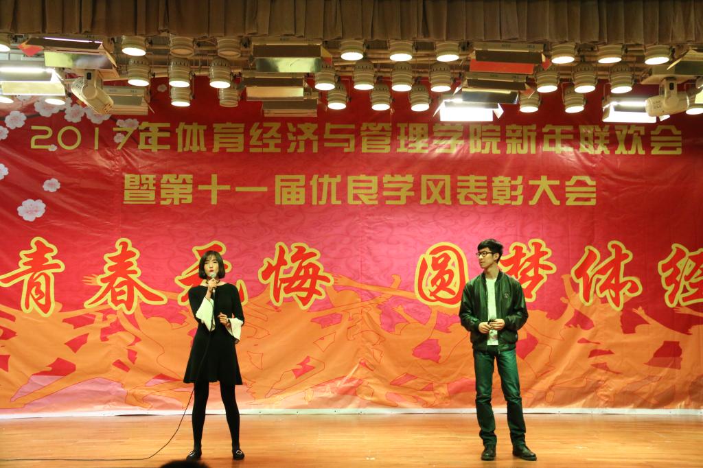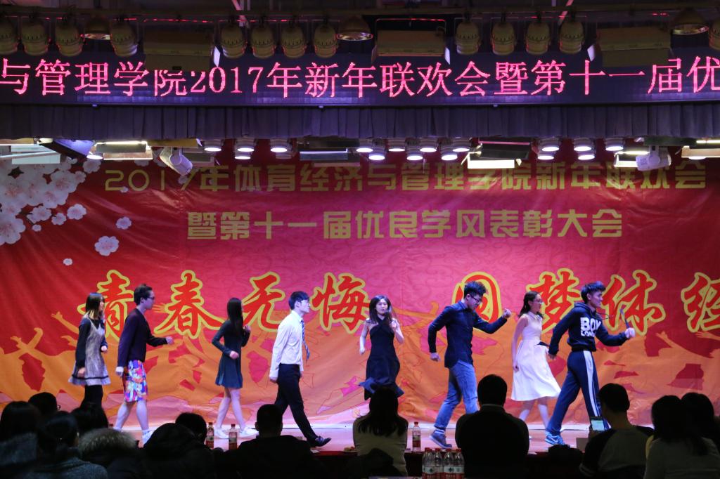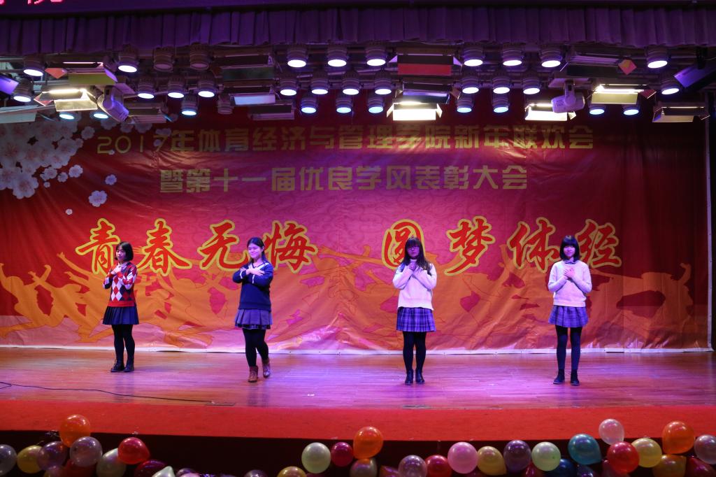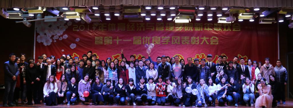 伴随着4个16级青春可爱的姑娘表演的舞蹈《新年快乐》,联欢会接近尾声“鼎故辞旧,旧雨重逢,丰年旧事娓娓道来;万象更新,新硎初试,龙马新声气势恢宏;我中央财大,如龙有灌日触天之才,吞吐大荒;我体经学子,似马有腾跃四方之志,担负乾坤”。忠诚、团结、求实、创新,这是中财大对我们的期许;笃思体行,我爱体经,体经会是一种信仰;过去的一年,我们尽善尽美,尽力做到最好;新的一年,我们当再接再厉,再创辉煌!“青春无悔、圆梦体经”太阳成集团tyc122cc2017年新年联欢会暨第十一届优良学风表彰大会圆满结束。