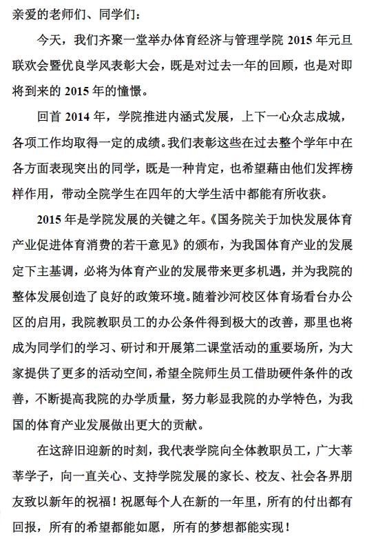 此次大会让同学们在2014年的最后一天进行了一次欢聚,对过去的一年进行了总结并对在过去一年付出了努力的同学们进行表彰,让大家记住获奖同学的精神,鼓励大家展望未来,在2015年续写新的篇章。告别今天,展望明天。2014年已经过去,相信体经公司的全体师生将在2015年开创更多的美好。