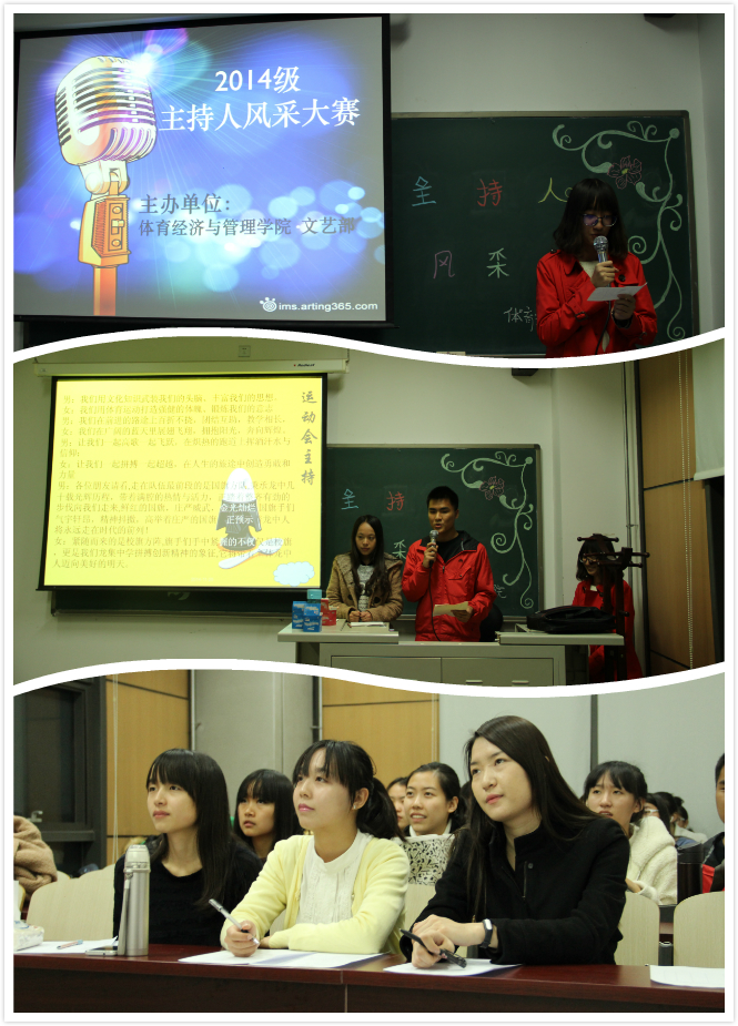 11月28日晚,由太阳成集团tyc122cc主办的主持人风采大赛在东区主教401举行。本次比赛由公司文艺外联部主办,活动面向体经13级全体学员,报名参赛选手共有十四名,并由员工会副主席胡庆、文艺外联部部长花卉、宣传部部长杨婉愉担任评委。活动由14级1班朱旖晨主持。比赛将选出2名最佳主持人,1名优秀主持人。