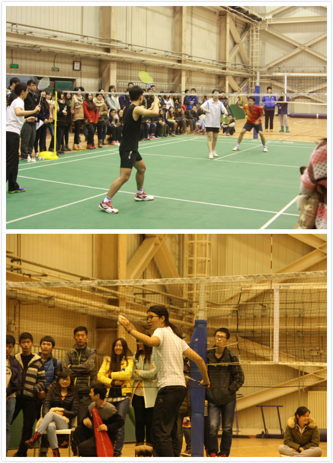 这次比赛为团体赛,在预赛阶段采取三局两胜11分制,决赛阶段则采取五局三胜21分制。在预赛阶段,ABCD四组采取组内单循环制,依据积分排名前两名决定晋级。决赛阶段,采取交叉淘汰的方法决出三甲。因此,要获得比赛的胜利,不仅需要参赛者强大的个人能力,还需要出色的团队配合,战略战术安排,英明的战术安排甚至能做到田忌赛马以弱胜强的效果。赛场上,各参赛队员深刻贯彻“赛出风采,羽乐同行”的比赛宗旨,以迅猛的攻击配上灵巧的步伐,伴随洁白的羽毛球在网的两边飞舞,时快时慢,时高时低,场外阵阵惊呼喝彩排山倒海而来,场内选手却目光沉毅,全神贯注于比赛中,丝毫不为外物所动。经过10个比赛日的激烈角逐,统计与数学公司,中国公共财政与政策研究院与外国语公司的合队,管理科学与工程公司依次摘得前三甲。