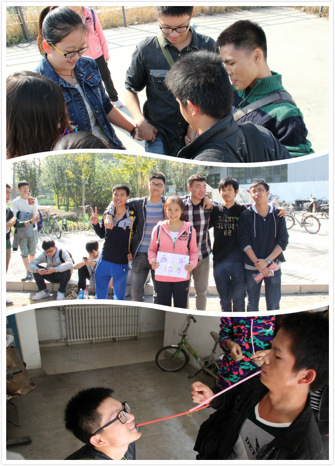 18日一早,同学们怀着好奇与兴奋齐聚教室,并在主持人的安排下,以8人小组形式正式出发。每个小组都同时有大一大二两个年级的同学,他们拿着特定的指示牌,根据所给线索寻找各个活动的地点。在这个过程中,对校园熟悉的大二员工们尽心尽力,在找到活动地点的同时为新生们介绍校园,使整体气氛十分融洽。六个活动地点分别进行着“跳大绳”、“画地为牢”、“跳跳跳”、“七手八脚”、“新华容道”和“环环相传”的活动。“跳大绳”“七手八脚”“画地为牢”非常考验组员们的配合程度和默契程度,“跳跳跳”是对体力极大的考验,“新华容道”“环环相传”两项活动非常有趣,同学们在游戏过程中欢笑不断。在活动的过程中,同组同学们团结协作、“马力全开”,每一个人都参与其中。倾听与思考并重,分析与交流并存,在活动过程中很好的拉近了相互之间的距离。最后,完成任务的队伍在终点相互交流并合影留恋。在热烈的气氛中,本次破冰活动圆满结束。