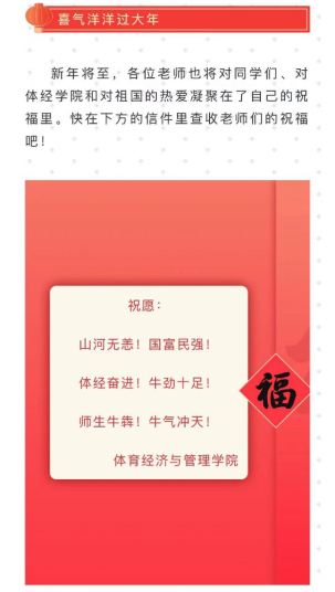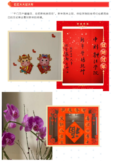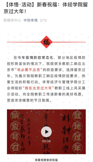 线上祝福活动在公司党总支书记林琼教授和经理张本家教授的带动下,留京过年的教职工积极参与,本次活动共收到20多位留京过年的老师们的短视频投稿。活动通过“红红火火多大年”、“健健康康过大年”、“喜气洋洋过大年”等专题,老师们用自己制作的短视频展示了体经人过年的各项准备、北京的年味及新春祝福。