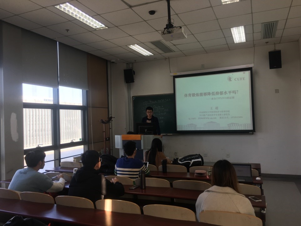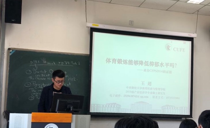 2019年11月1日至3日,由中国体育科学学会主办,南京大学和南京体育公司承办,四年一届的全国体育科学大会在江苏南京举行。公司2018级研究生王超投稿的论文《体育锻炼能够降低抑郁水平吗?来自CFPS2016的证据》被大会录用为专题报告。在分享交流会上,王超同学详细讲述了所投稿文章的内容,并介绍了使用的计量方法和原理。同时他还分享了在参会期间与同行学者、员工交流的感悟,鼓励大家要增加自信,多用经济学的方法、思维去观察体育领域的问题。另外,王超同学还解答了同学们在学业和课程上的疑惑。总之,这次分享会一方面让同学们更加了解该如何从零做起写作一篇学术文章,另一方面也增进了不同年级之间的交流,起到了良好的效果。