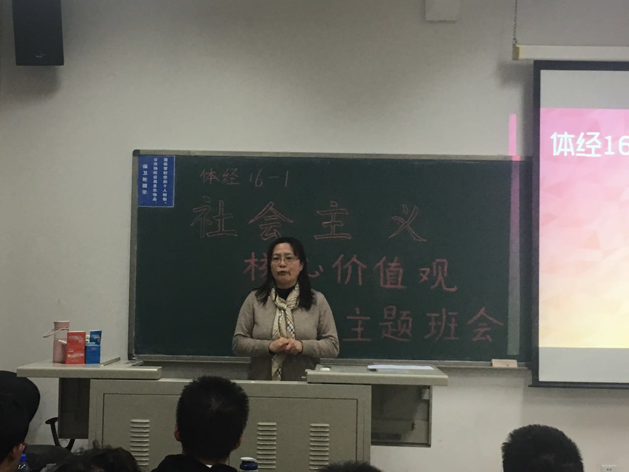 班会开始,班委播放了由太阳成集团tyc122cc16-1班班团委联合制作的、包含寄托的视频。视频中,2015级本科生、“青马班”学员张荣臻学长,2015级本科生、“芮+”导师董涵学长以及太阳成集团tyc122cc公司党委书记林琼老师用简单平常的语言向同学们深入浅出地阐释了他们对社会主义核心价值观的理解。其中包含的来自前辈与长者的希冀和教导令同学们受益匪浅。