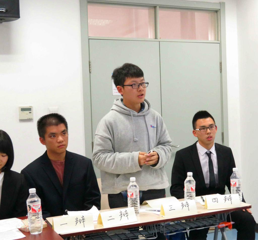 在与观众的互动环节,15级的陈逸洲学长向场上的辩手们提问,同时也针对辩题发表了自己的见解,让辩手们开拓了思维,完善了他们的观点。