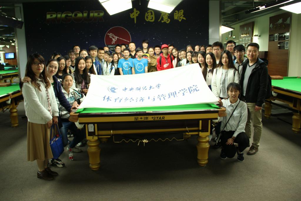 活动会场位于北京体育馆一层的世界斯诺克公司,这里同时也是瑞盖科技有限公司训练基地。甫一入场,就看见会场的背后是排列整齐的台球桌。据介绍,其中一排的台球桌是国家队训练时的球员专属台球桌。之后,由活动的主持人瑞盖公司代表王迎春女士将公司师生引入会场就座。