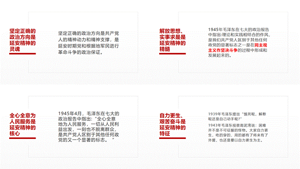 坚定正确的政治方向是延安精神的灵魂。坚定正确的政治方向是共产党人的精神动力和精神支撑,是延安时期党和根据地军民进行革命斗争的政治保证。坚定中国特色社会主义的理想信念,是共产党人必须忠诚的事业。建设中国特色社会主义,是中国发展唯一正确的道路。