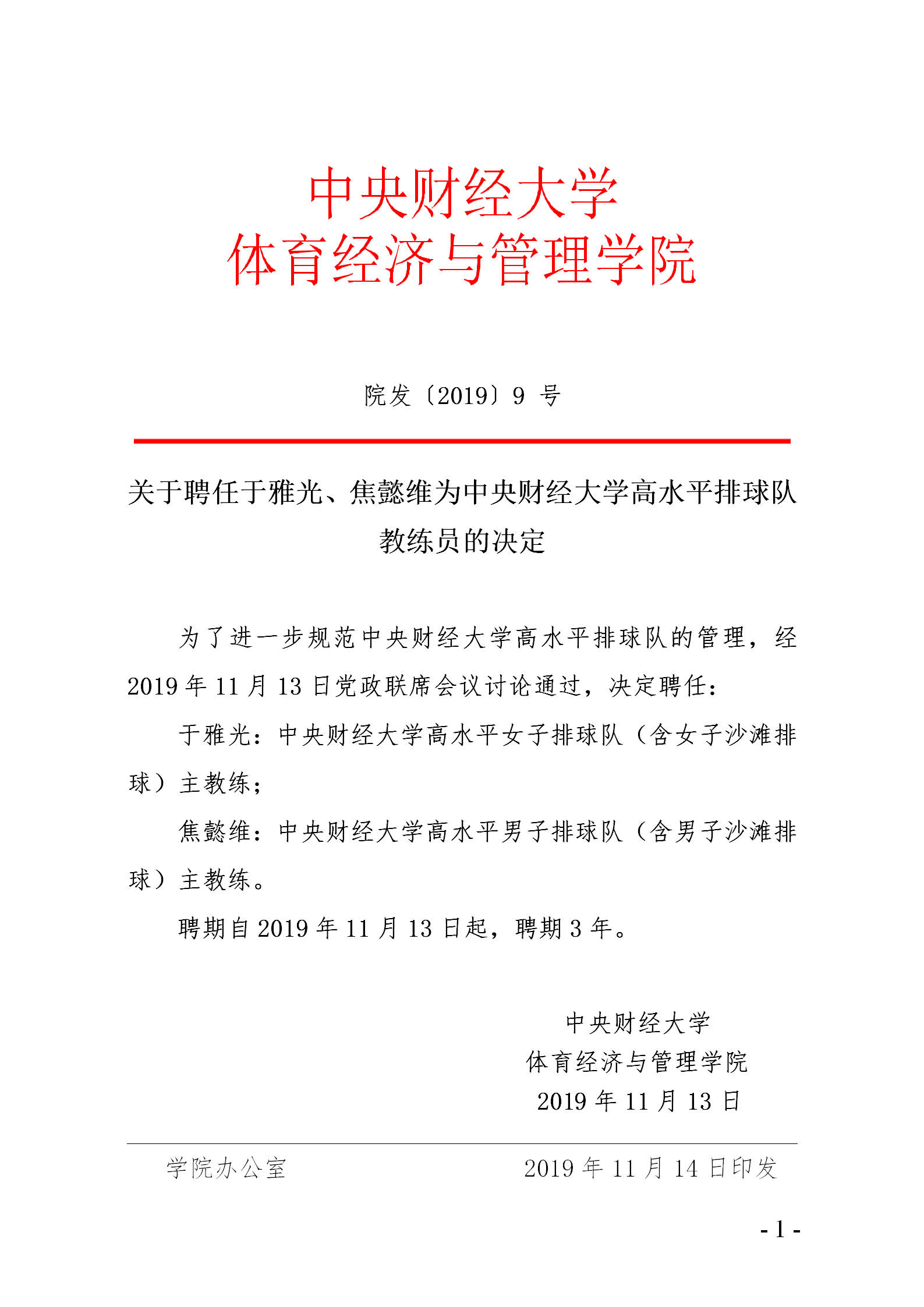 院发〔2019〕9 号 关于聘任于雅光、焦懿维为古天乐代言太阳集团高水平排球队教练员的决定