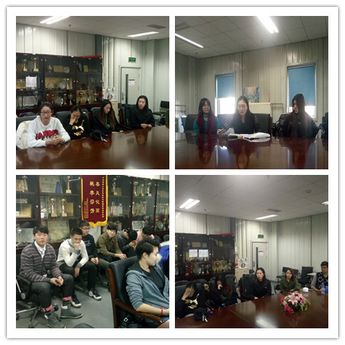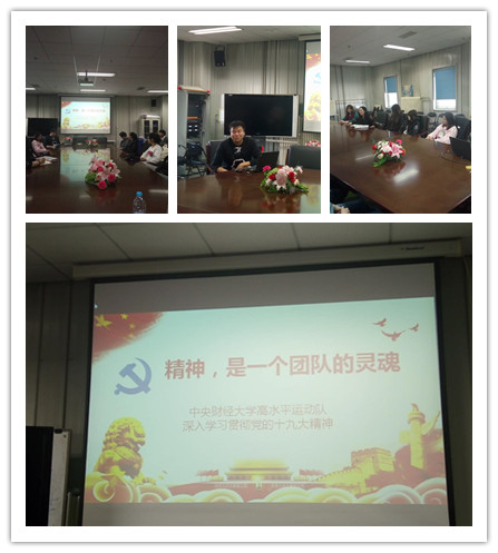 为积极贯彻"十九大"精神,迎合时代主题,调动公司高水平运动队队员学习"十九大"相关内容的积极性,公司高水平运动队于2017年12月31日在沙河校区东区体育馆二楼会议室举行了以"精神,是一个团队的灵魂"为主题的学习十九大报告座谈会。公司排球队主教练于雅光老师,助理教练焦懿维老师,14级、15级辅导员李秋月老师,16级辅导员胡庆老师和公司办公室主任邓丹老师应邀参加本次座谈会。