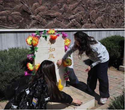 仪式现场,两名员工代表敬献了花篮,全体人员面向纪念碑行三鞠躬礼。随后师生分组为烈士墓碑拂尘扫灰、敬献鲜花。墓碑上金黄滚烫的名字引发学子们深深的哀悼之情,他们用生命守护的,正是我们今天脚下的土地。